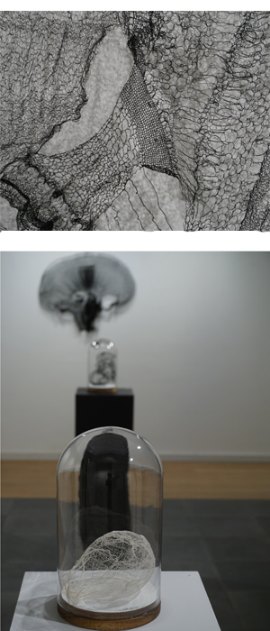 arlette lories tisse des oeuvres monochromes noires ou blanches. Bien qu abstrait, son travail pourrait évoquer, chez certains, des images figuratives. Un jeu d ombres découle de son écriture avec le fil; le noir y vibre. Fils de soie et